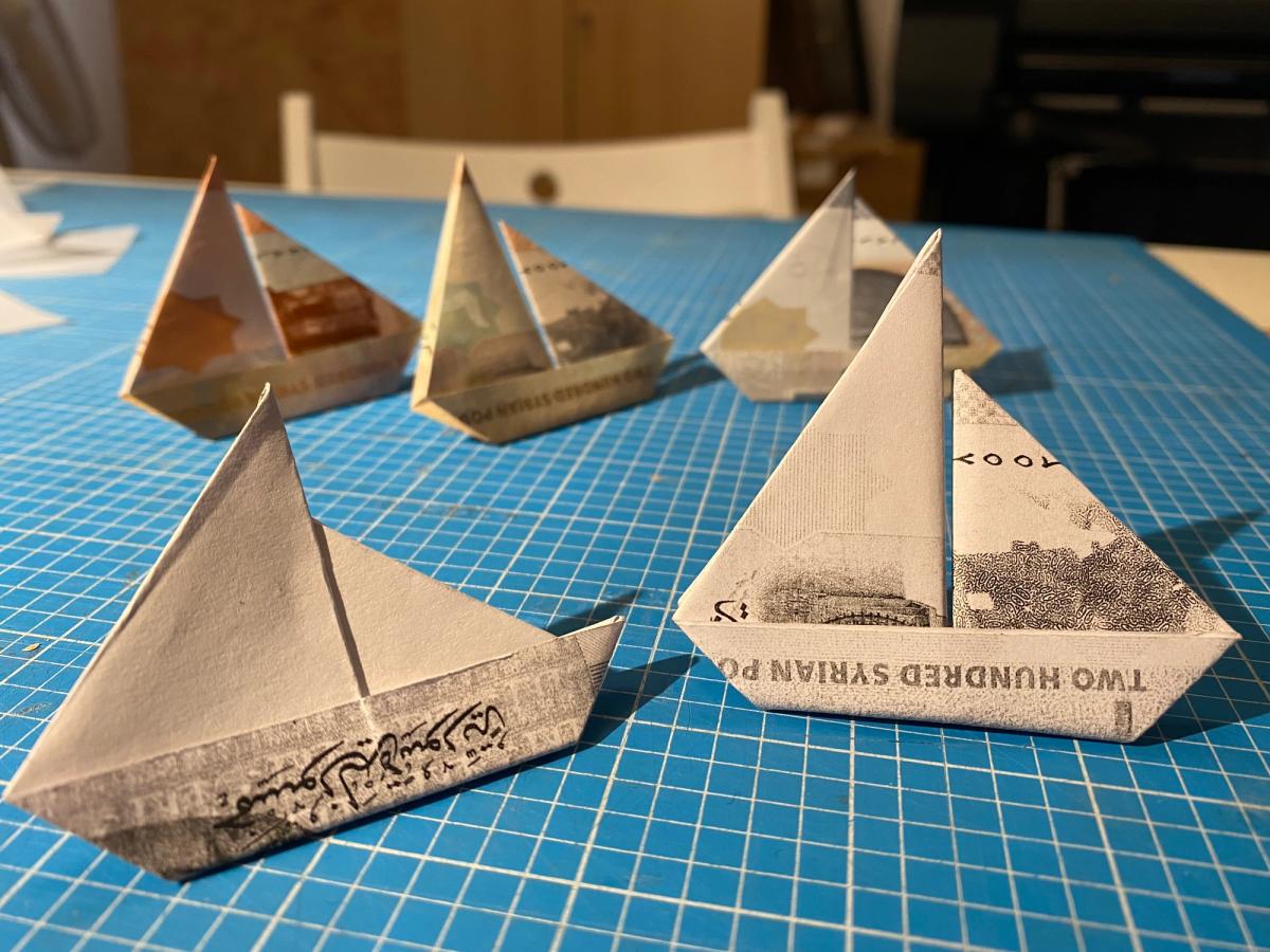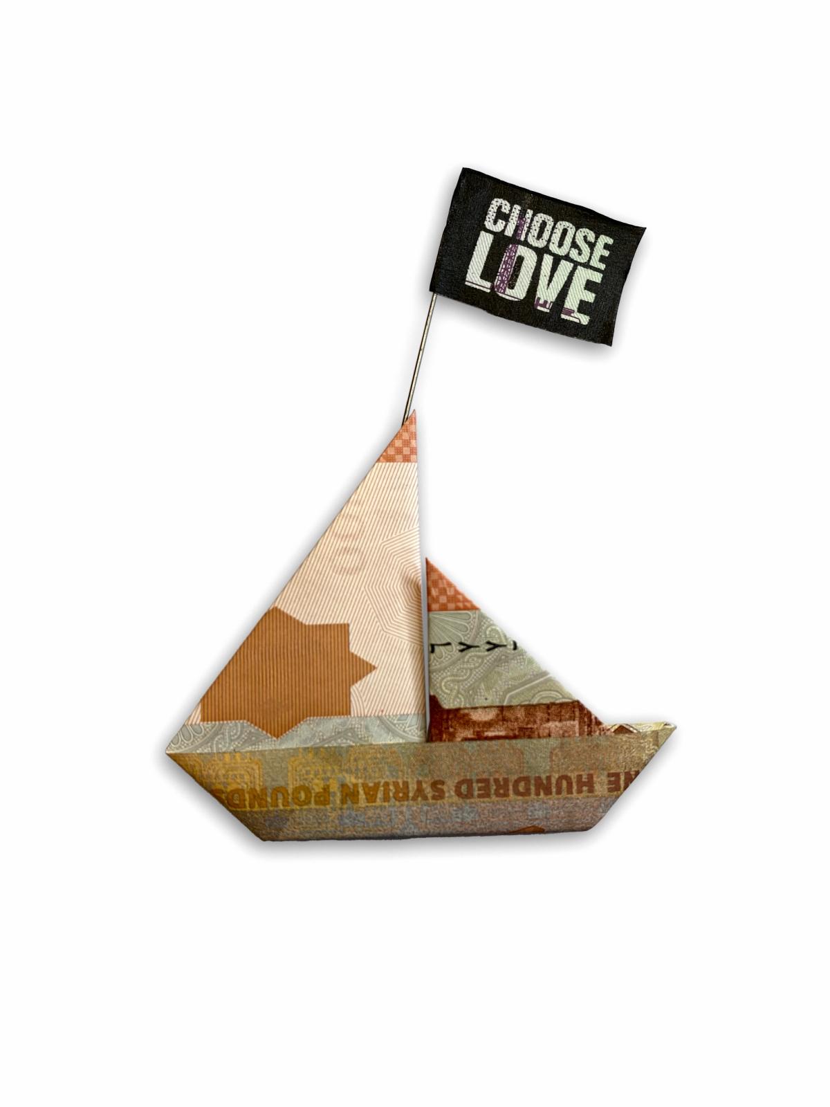 Dan Vo: Aida Wilde is a screen printer, street artist and activist who knows what it's like to experience displacement. In a piece she created to support refugee advocacy charity Choose Love, Aida uses boats as her inspiration. Rafts filled to capacity, making the perilous journey through the Mediterranean Sea, small and fragile, full of desperation and hope for a better future. Boats like these have become a symbol of the refugee crisis all over the world. Using repurposed Syrian banknotes, Wilde created ‘Dreamboat II’, a tiny origami boat waving a flag with the logo of the Choose Love campaign. Even the ink for the flag was made from pulverised Syrian currency. This piece is small and delicate, but it calls on us to remember the resilience of refugees rebuilding their lives in the aftermath of war, persecution, and natural disaster. Dreamboat II will be on display at the Fitzwilliam Museum as part of the ‘Defaced! Money, Conflict, Protest’ exhibition from the 11th of October 2022 through to the 8th of January 2023.