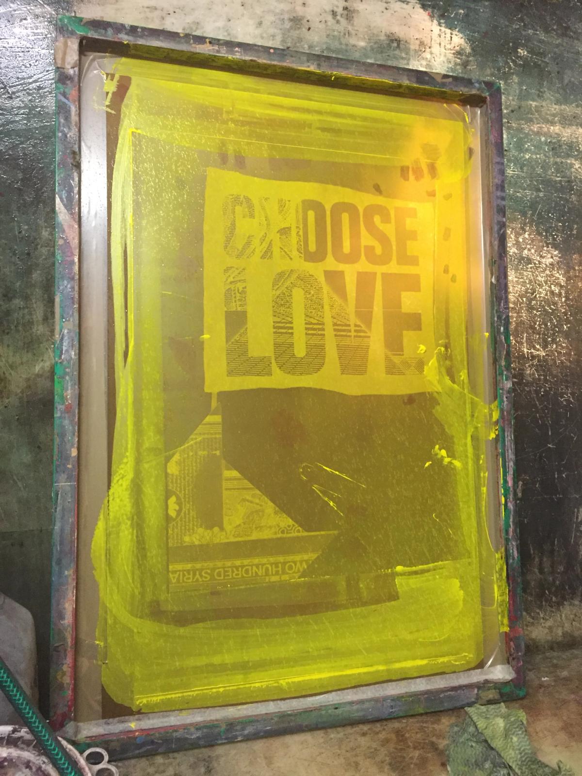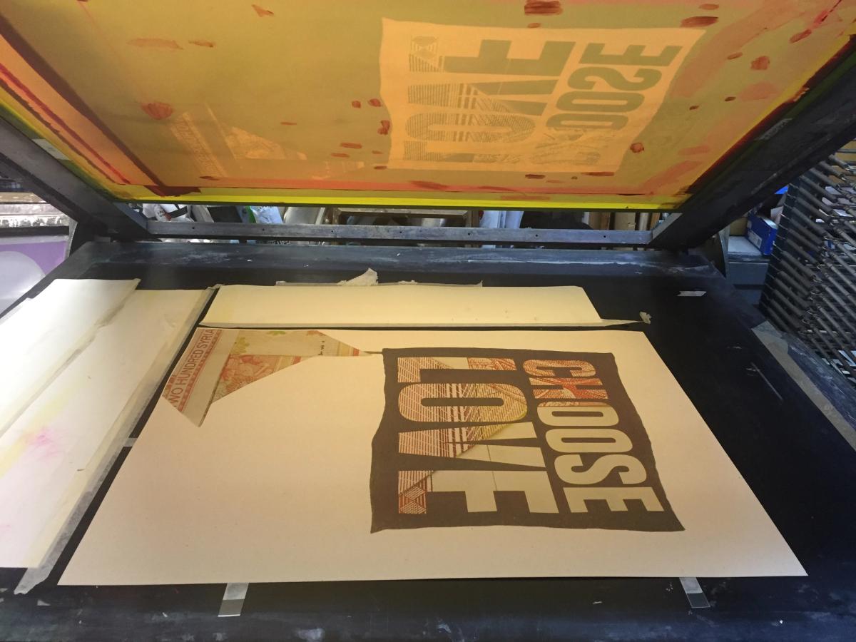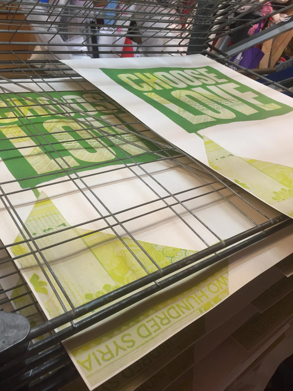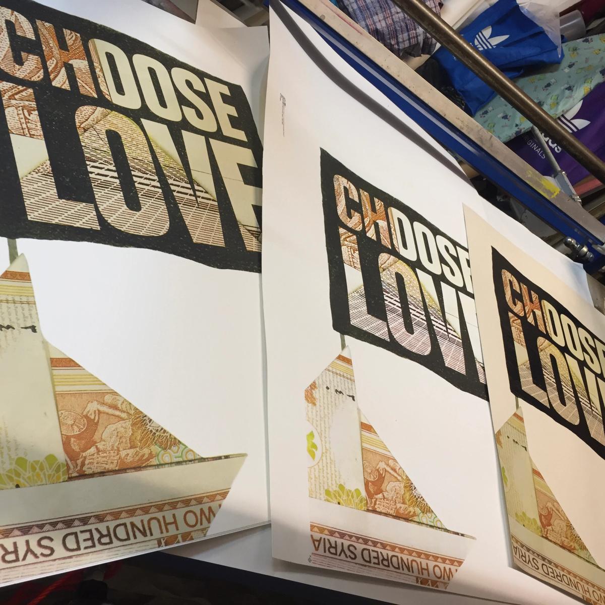 Aida Wilde: Yes, there's pulp involved – well, there's disintegration – but I discovered that you actually can't really pulp a note! It's a longprocess. I've printed with all sorts of weird things – I've burned my work and turned it into dust and printed with the ashes. I've printed with brick. I've printed with anything weird you could think of. So, this note involved three months of exploration. I literally pulped, soaked, mashed, and scraped away, and I got something like half a kilo of this pulp that I mixed into different sort of colours and ink medium, that I printed the Choose Love logo with, onto the origami boat. I think in respect when you look at look at the simplicity of the final outcome you don’t realise that as much work has gone into just printing that tiny little Choose Love flag as the process of the origami.