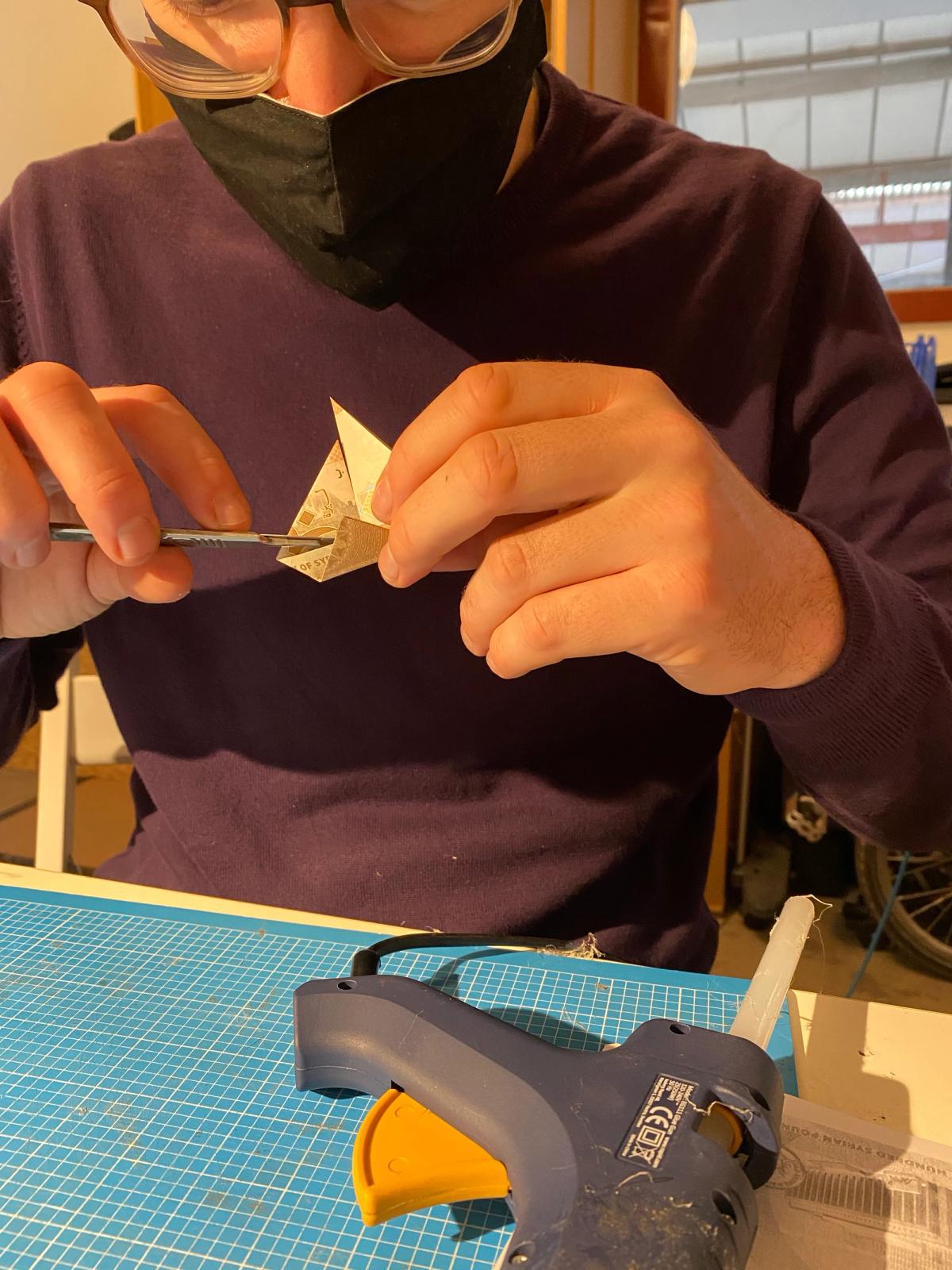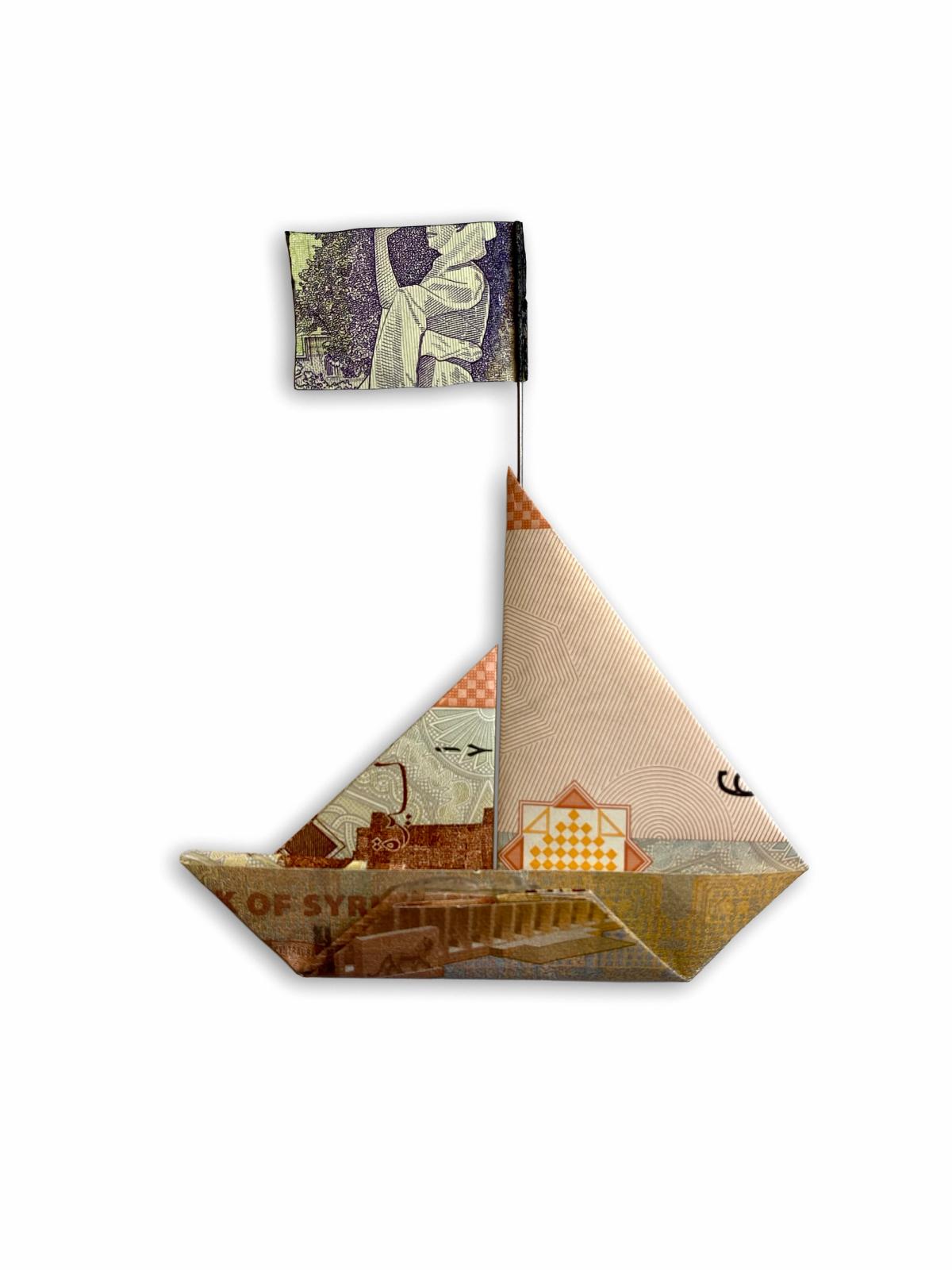 Dan Vo: This whole work is very much raising awareness around the refugee situation. It's an origami work, so the note has been folded up to make up this boat.