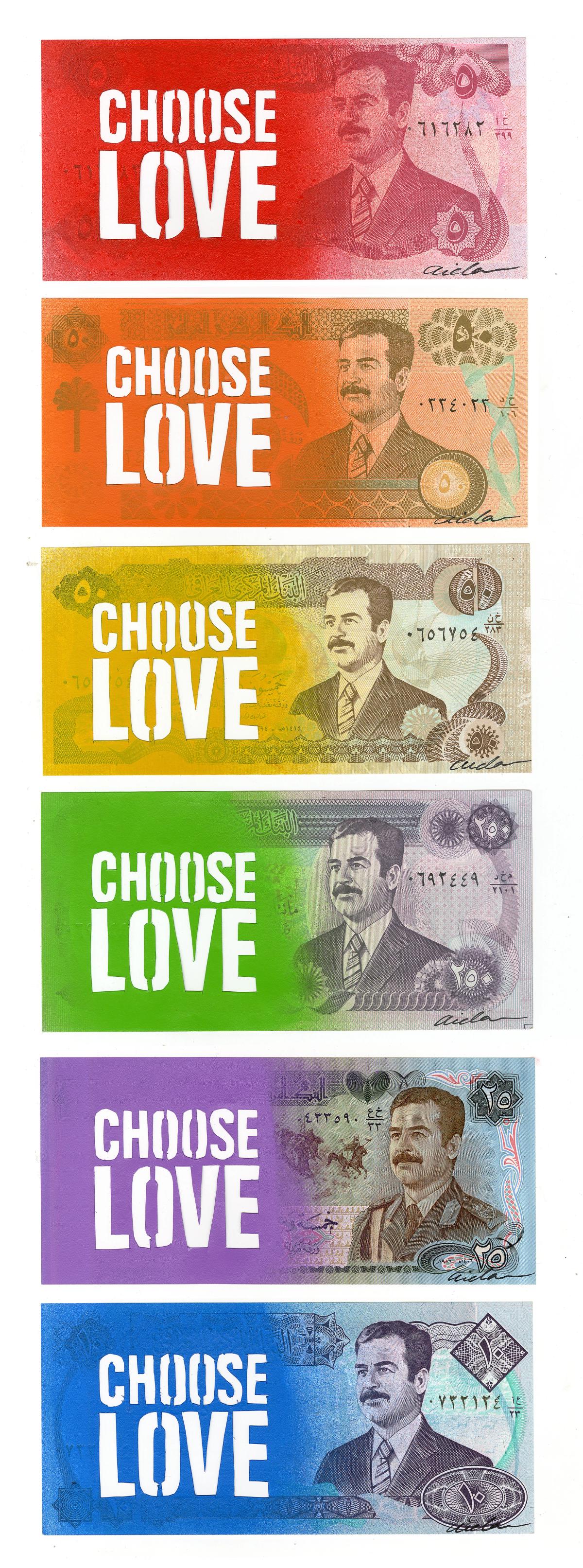 Aida Wilde: Yeah, there were these Iraqi notes with Saddam Hussein's face on. I remember the curators came to my studio and said, ‘oh, and we have these for you to work with’. And I was just repelled. I was like ‘oh thank you so, you know we've got enough to get on with, without this’, and I left Saddam to the side. I didn’t want to work with them, and it was only as I was working through ideas for the other notes that I had this revelation. I was examining Saddam's tyranny and reign and thinking about LGBTQ+ rights, and people getting stoned for their sexuality, and that's where the rainbow idea came from for these Saddam Hussein notes. Reimagining these notes as a rainbow flag links us to the horrific human rights abuses LGBTQ+ people in Iraq have suffered, and to the experiences of LGBTQ+ refugees who then have to ‘prove’ their sexuality once they reach safety. I printed a Choose Love on each of these notes in different colours, but then as a stencil, I cut Choose Love out, and I used the note to spray a rainbow-coloured artwork from it, which used all of the notes.