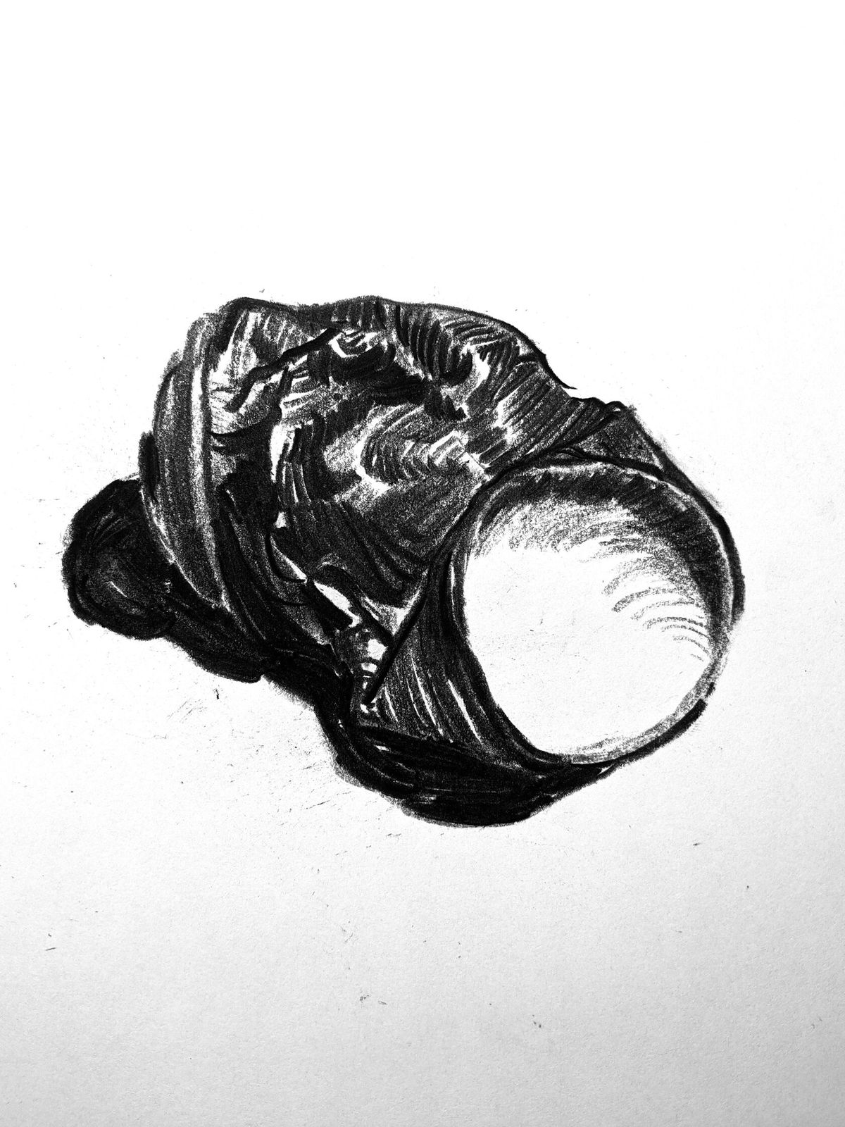 The series ‘1/36’ (ongoing since 2019), on the other hand, captures an intimate process, with the camera literally between the artist and the wall, yet save for a few images in which we see a spray can, there is again an absence of concrete information and situation (Figure 3). Taken at night, on 36-frame photographic film, these were blind photographs for both OK and the subjects, with no viewfinder, checking or deleting, no flattering angles, posing, or direct looks. Such an intimacy is created that one can only imagine the power each of these moments held, what was going through the mind of each of the artists, what they did immediately before and after. The series succeeds at leaving the viewer more intrigued by these questions than over what the artists' final creation might have been. In ‘Study for Crumpled Spray Can’ (2019–present), however, we move from a powerful absence to a somewhat pathetic presence (Figure 4). These drawings are a personal comment on how the spray can as a medium lost its power for OK, signifying a move into charcoal – which, almost mockingly, is what he used to make them – and what he referred to as ‘breaking the habit [of graffiting]’ (OK interview, 2022). Also of note is the intimacy afforded by the direct contact of charcoal to the paper, as opposed to the space between implement and surface in graffiti, although OK certainly explored and stretched that concept until he found the space in between, whereby charcoal would reach its surface in particles or through an intermediary surface, rather than through direct, drawn contact.