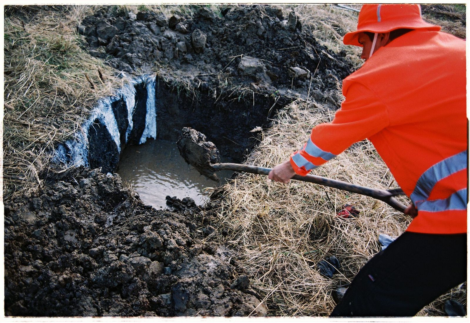 OK has also at times made interventions to the works of other artists, that likely happened without comment as they were not fresh pieces made by festival colleagues. These come in the form of his stick-figure logo (composed of his initials) which crops up seeming to surrender before – or perhaps attempting to stand strong and block – an advancing tank or soldier with his bayonet raised. Subtitled ‘Collaborationism’ (Figures 10 & 11), these unagreed collaborations with other artists have added new meanings and context. Graffiti truly is a world of layers (Andron, 2019): of buffs, collabs, interventions, and the erosion of surfaces revealing a new canvas beneath or perhaps reaching their limits, that cover up as much as they are on the top. Sometimes OK's graffiti is so high, low, small, or buried that no one can see it. The covered or hidden is another key facet within OK's practice: after hiding in plain sight as a council worker at the Kurskaya Wall or behind a mask of his own face, painting in little-seen locations such as an old train carriage near his dacha, or making small marks in hidden corners, for ‘Underground’ (2020), OK dug a hole in a field, sprayed his tag on one of its muddy walls, and filled it in again (Figure 12). The question of whether it is possible to make graffiti where nobody sees it – quite literally in this case because it is buried, and by now has more than likely been completely disintegrated by the wet earth – makes us reflect once again on whether graffiti equates to its product or its process, all the while juxtaposing labour against results.