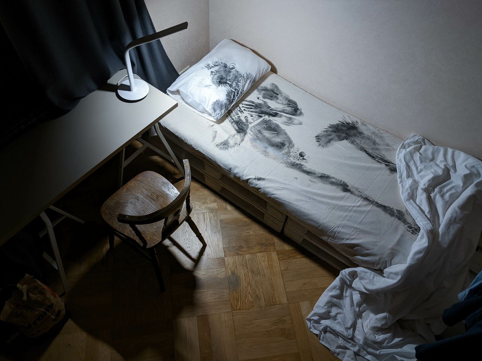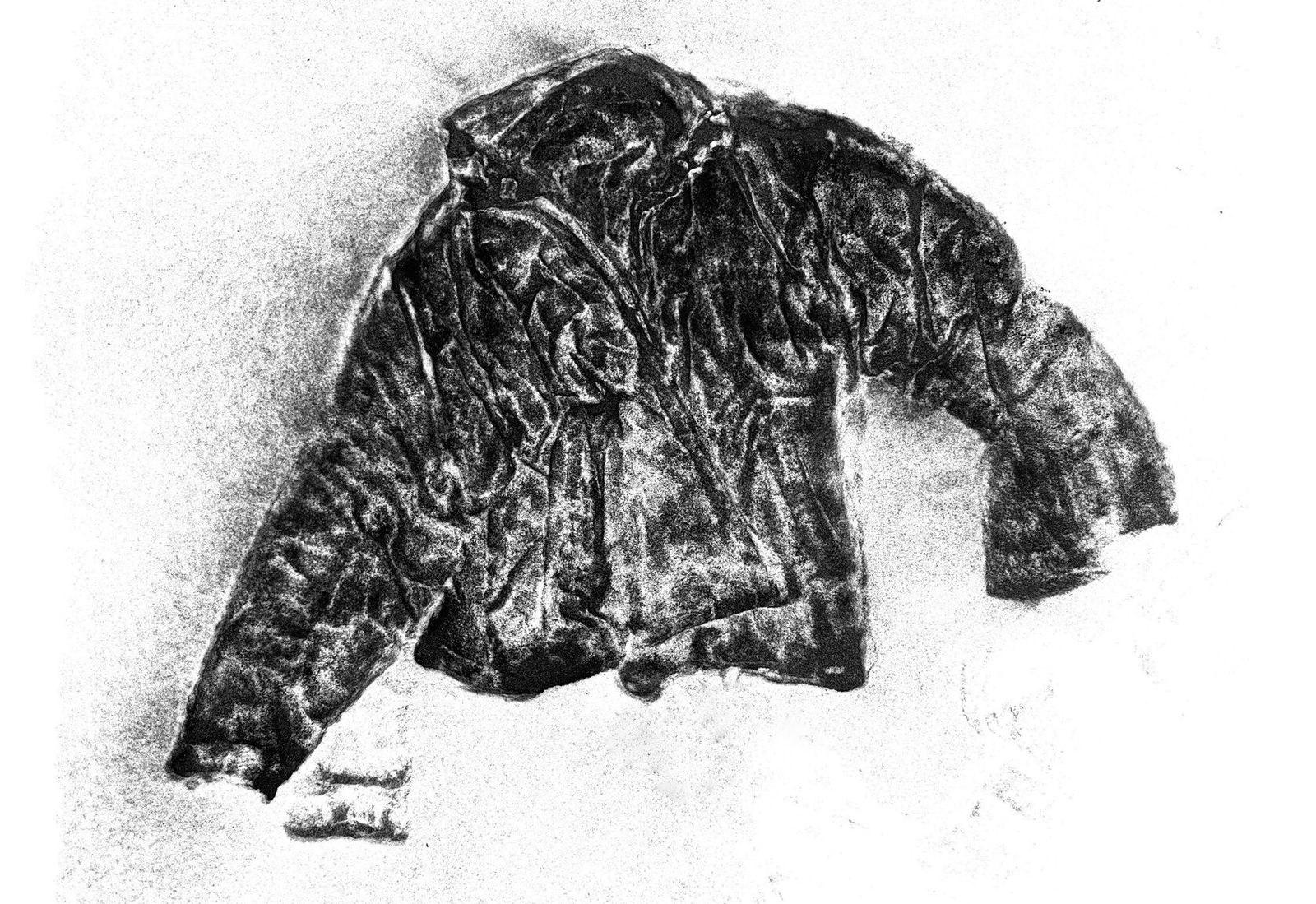 One such example is a part of the immersive installation ‘Who Lives in My Wardrobe?’ (2020). Rare in his portfolio for being an interior-based piece, it consisted of OK's bedroom space behind wardrobes that he had converted into a Narniaesque entrance, and on the bed an imprint of his naked body formed by smearing himself in charcoal dust and laying down on the sheets (Figure 5), the result being reminiscent of David Hammons' body print works. OK then invited people to come and visit the work in his shared flat when the time came to move, allowing visitors into his space between wardrobe and wall for one evening only. Also carrying forth the very Soviet-era concept of apartment exhibitions (albeit without the political reason for a clandestine event), it was even more intimate, with the sensual imprint of his body at its most private and vulnerable. For ‘Snow Prints’ (2019 – present), he laid items including a jacket, a broom, or himself, onto snow to make an imprint, before using sandpaper to grate charcoal onto it, creating something of a reverse X-ray-type image (Figure 6). Unlike a solid wall where there is a chance (however small) that graffiti will survive somehow, nature dictates that a work on snow is destined to disappear every time. This inevitability, along with the fact that the objects themselves are rather mundane, is perhaps one of the most perfect representations of the ‘process-over-product’ mantra of their maker.