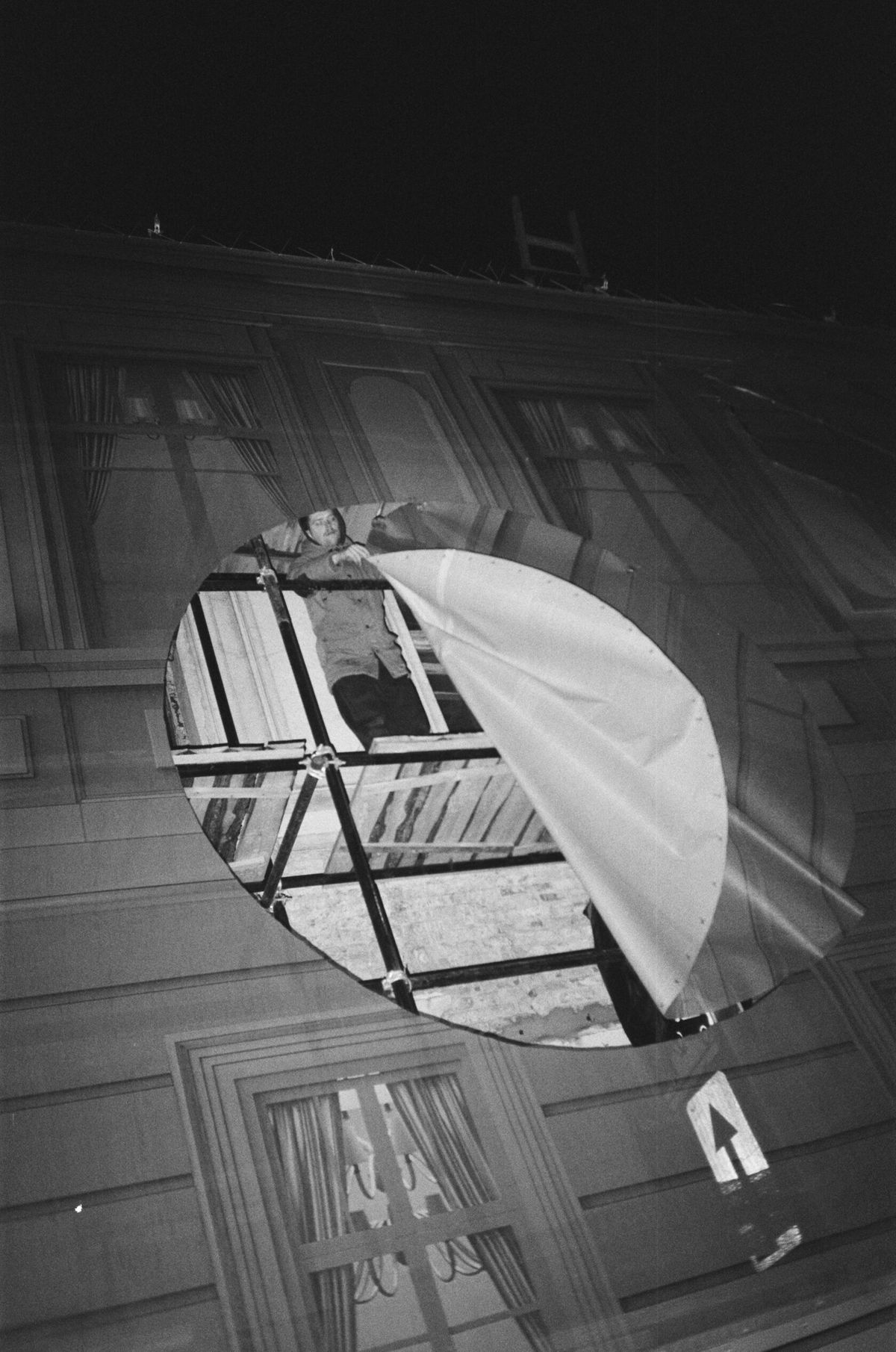 Another subtle, near invisible, refilling of a space constitutes the work ‘Self-Collage’ (2021), except this time OK is in the centre of town, intrigued by the communal practice of workers. Just as Kirill Kto was cutting eye shapes out of banners a couple of generations of Moscow street artists prior, or even before that, when Brad Downey cut a heart out of tarpaulin covering scaffolding on an Aberdeen building for ‘Ladder Stick-Up’ (2007), OK cuts shapes out of material covering building renovation works (Figures 13 & 14). Usually circles, he puts them back, albeit rotated slightly, carrying out double the labour of the worker whose job it is simply to patch up holes. It is a delicate play of poetics in public space, a lesson that adornment doesn’t have to come from big, bright, commissioned murals, or through adding something to make a collage. These interventions might be read also as a metaphor for the economy of sustainability, the accessibility of art, and of making something out of what you already have, even just by viewing it from a different angle and refilling a space with something that was already there.