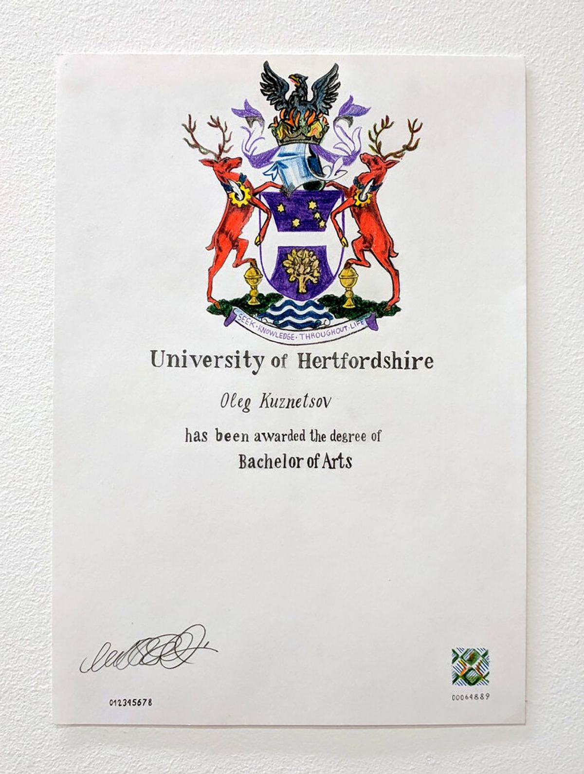 In short, through art, OK has made meaning out of an enforced ‘duty’ that for him had no significance, out of the ownership of his time, and even out of putting into practice his ideas about simply making art without meaning (as paradoxical as it may seem here). It was Joseph Kosuth who affirmed that ‘art is making meaning’, and one can also perceive a sense of his great ‘One and Three Chairs’ here, with OK's original task, his reenactment, and its documentation on his website taking the seats of Kosuth's real chair, image, and descriptor. OK in fact directly references this in his ‘Sketch to the Work #1’ (2018), a coloured pencil drawing of his degree certificate from the British Higher School of Art & Design (Figure 8). He exhibited it in his graduation show, describing how alongside the original, the image – albeit not a perfect digital copy – also constitutes a description of itself, leading him to conclude, ‘I have one and three diplomas’ (OK interview, 2022). The final product of the degree, symbolised by the certificate, and even the art show, did not matter to him in the way that the actual experience had, yet he understood that to his parents these were likely the key indicators of his success. Drawing his certificate to display in the exhibition was therefore another way that his art was a process in navigating the space in between his convictions and those of others in a poetic and sensitive