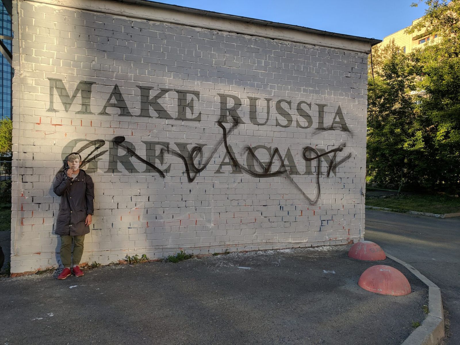 OK's intervention at Carte Blanche, a street art festival held in Yekaterinburg in July 2018, brought to the surface these problematics. Organised by Russian street artists of near-celebrity status such as Slava Ptrk, permission had not been requested from the authorities in line with the intention that the festival be based in the true illegal roots of street art. Nonetheless, the event did not come under any fire for this (perhaps partly because Yekaterinburg is one of the most street-art friendly of all Russian cities), meaning that it might not be preposterous to suggest that Carte Blanche may even have inadvertently complemented blagoustroistvo for how it illustrated the city with figurative murals and photogenic text art statements, all mounted perfectly within their wall canvases. OK headed to the festival in its last days and contributed by illegibly scribbling over parts of these fresh pieces, before having his photograph taken next to them, wearing a mask of his own face in a nod to how underground graffiti artists usually conceal their identities (Figure 9). At first applauded as a radical response, by some scribblings later, it had angered many of the festival artists, who called him to their hostel, where they did not allow him to leave for the whole night while they demanded explanations and that he pay damages for his interventions on their works. To defend private ownership of a work that many might say should be public property from the moment the spray hits the wall (Bonadio, 2018), seems in itself a bizarre stance from supporters of graffiti's illegality. More than three years after this edition of Carte Blanche, Slava Ptrk wrote a long post on Facebook to publicly apologise for this reaction, in which he explained: