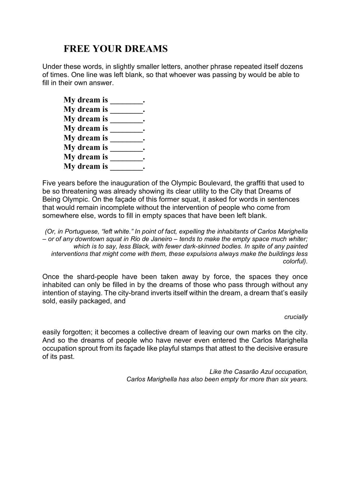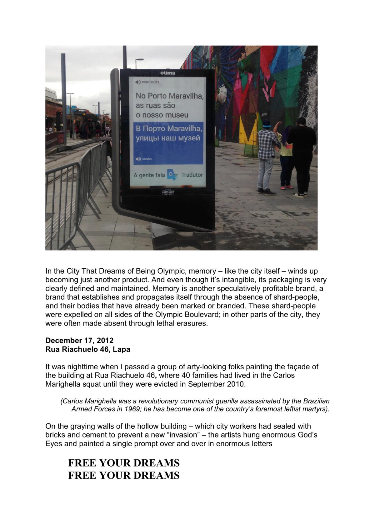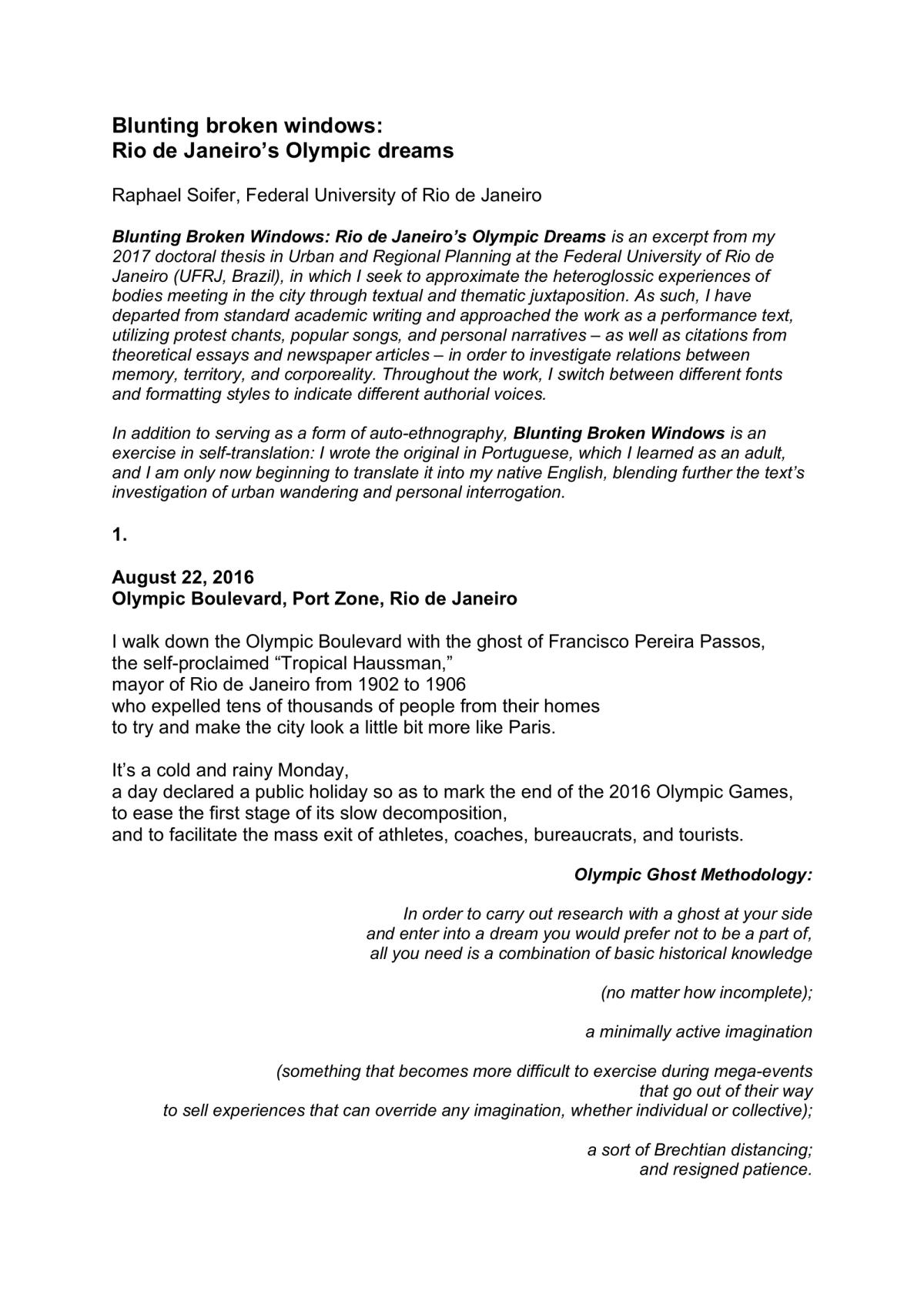 Raphael (Raphi) Soifer is a performance artist, researcher, and mess-maker from the United States. Since 2010, he has been based in Rio de Janeiro, Brazil, where he investigates the aesthetics of power and protest in urban spaces. He is a member and collaborator of various street art collectives in Rio, and holds a doctorate in Urban and Regional Planning from the Federal University of Rio de Janeiro.