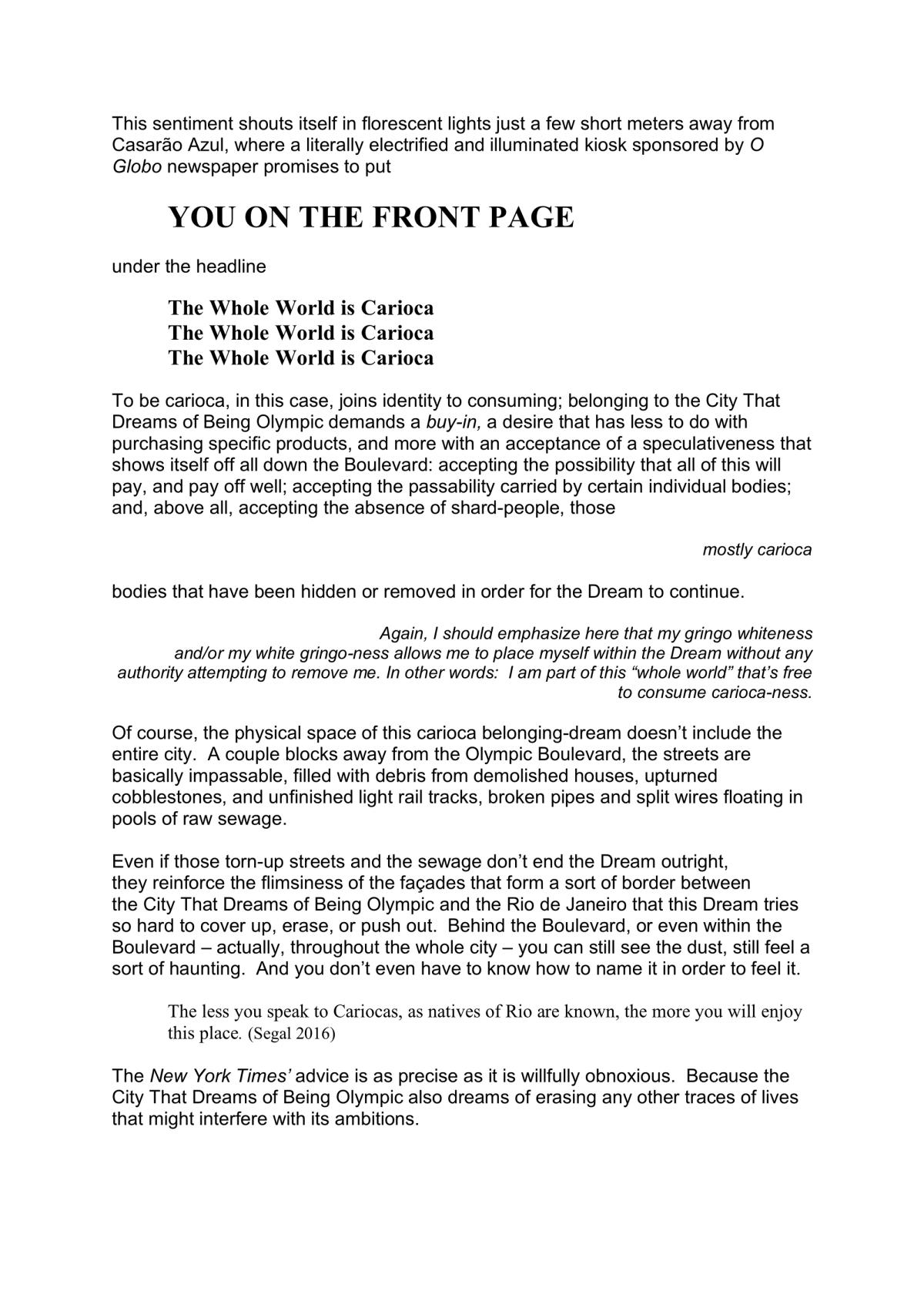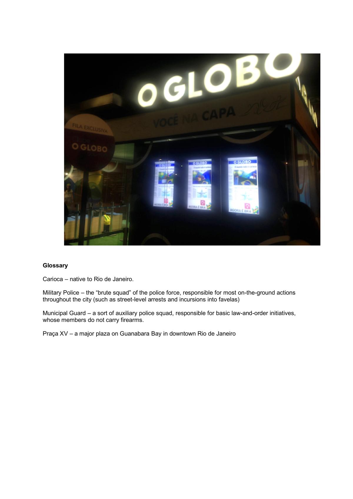 Segal, D. (2016) Many Soldiers, Few Signs, Long Lines: The Rio Games Beyond the TV Screen. In New York Times, August 10, 2016. [Online] Accessed August, 2018. https://www.nytimes.com/2016/08/11/sports/olympics/rio-games-2016-beyond-the-tv-screen.html