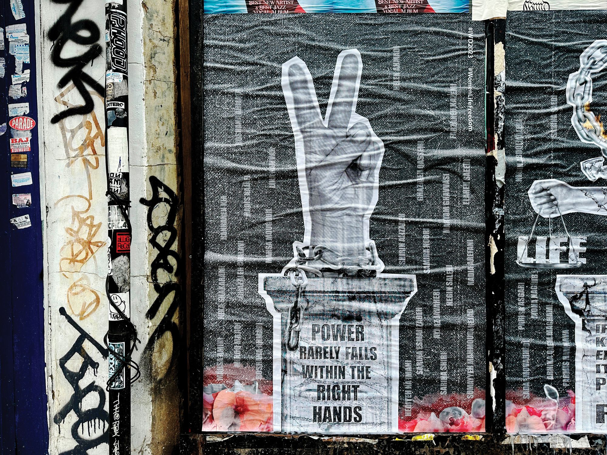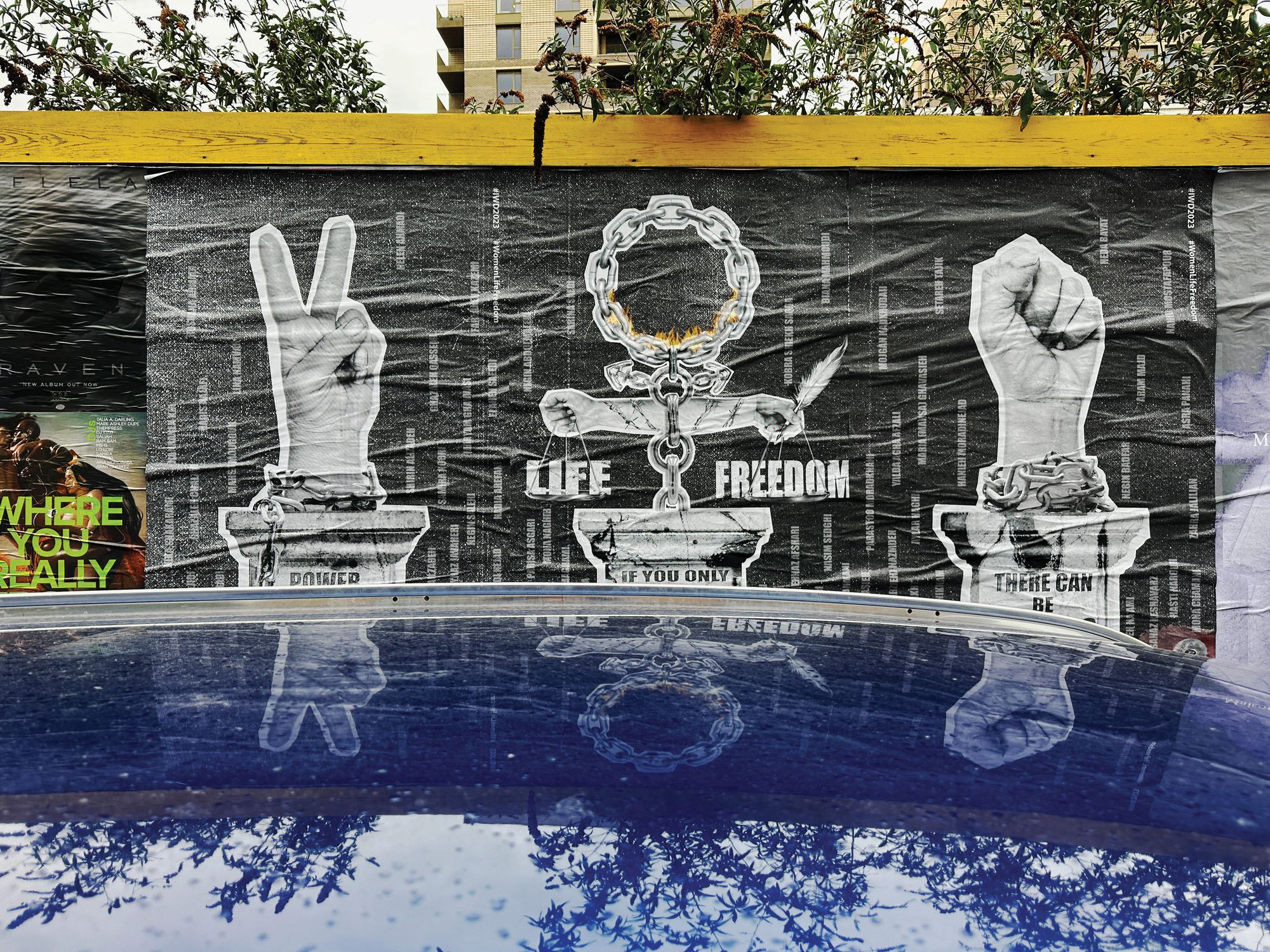 My sister is the Iranian poet Ziba Karbassi. Here, I arm her hand with a quill, connecting my own street-based public visual intervention to my sister’s quiet – but no less powerful – poetic acts of resistance:
